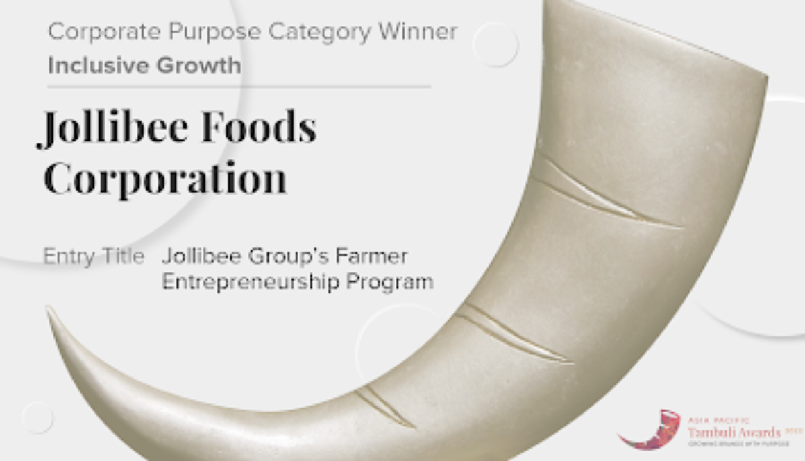 The Jollibee Group was recently recognized by the Asia Pacific (APAC) Tambuli Awards 2022 for promoting Inclusive Growth through its Farmer Entrepreneurship Program. The program engages multi-sectoral partners to train and enable small farmers to become entrepreneurs to improve their livelihood.