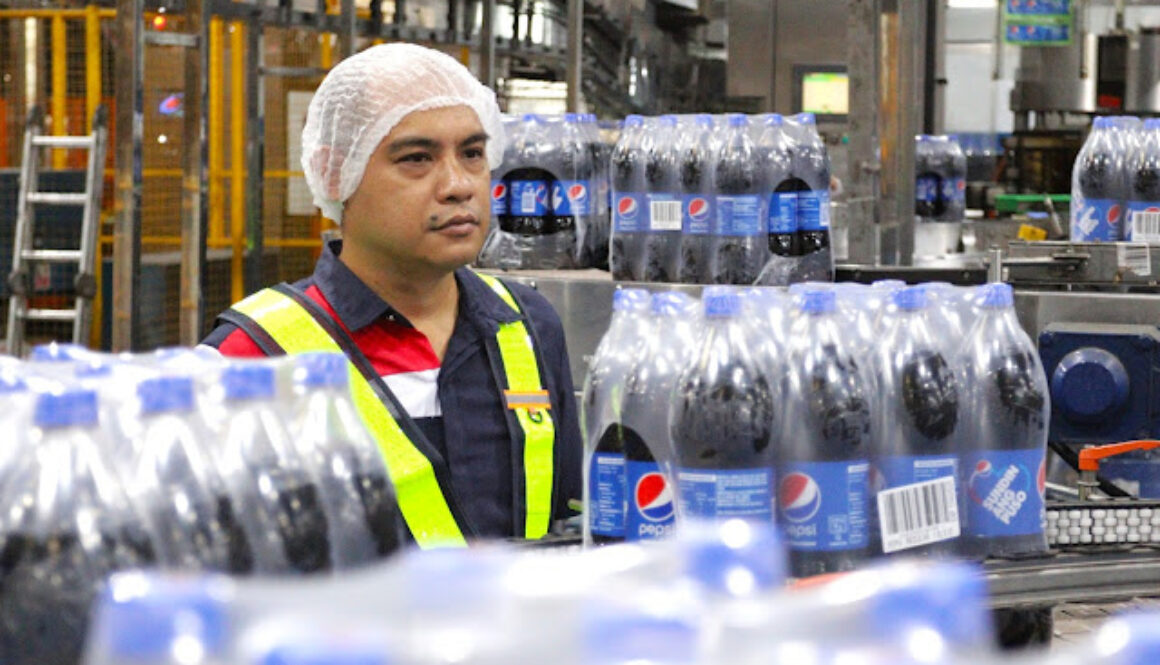 Pepsi-Cola Products Philippines, Inc. (PCPPI) strengthens focus on ensuring safety and security. Employee engagement is key to implementing policies and standards across PCPPI’s nationwide locations. Shown above is an employee overseeing product inspections.
