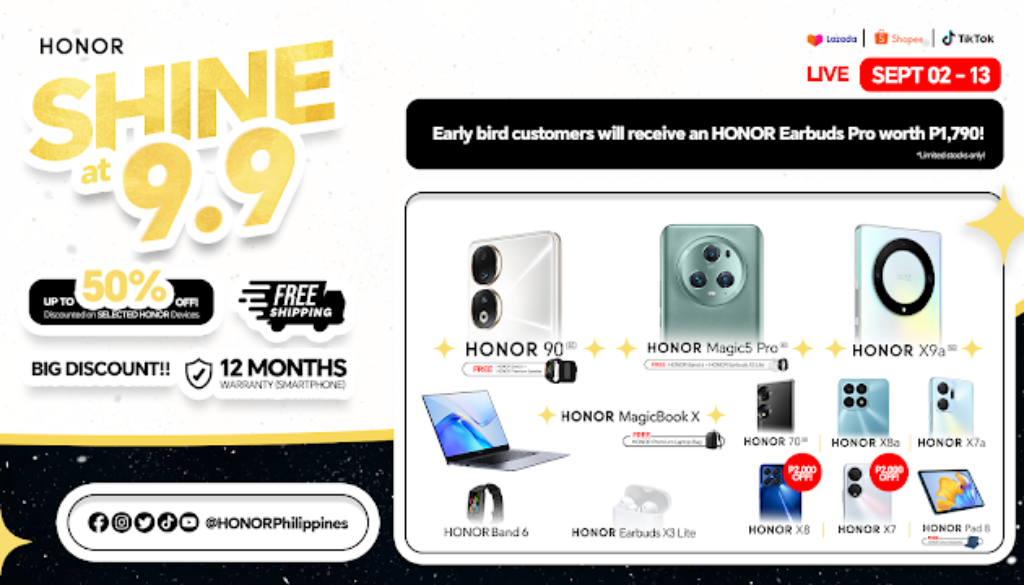 Treat yourself with your favorite HONOR Gadgets this 9.9 Sale. From the record-breaking HONOR 90 5G to the viral HONOR Magic5 Pro as well as HONOR X Series, you can get up to Php 2,300 off and a FREE HONOR Band 6 worth Php 1,790 when you shop on Shopee (bit.ly/HONORShopeeShine99), Lazada (bit.ly/HONORLazadaShine99), and TikTok (bit.ly/HONORTikTokShine99) from September 9 to 13, 2023!