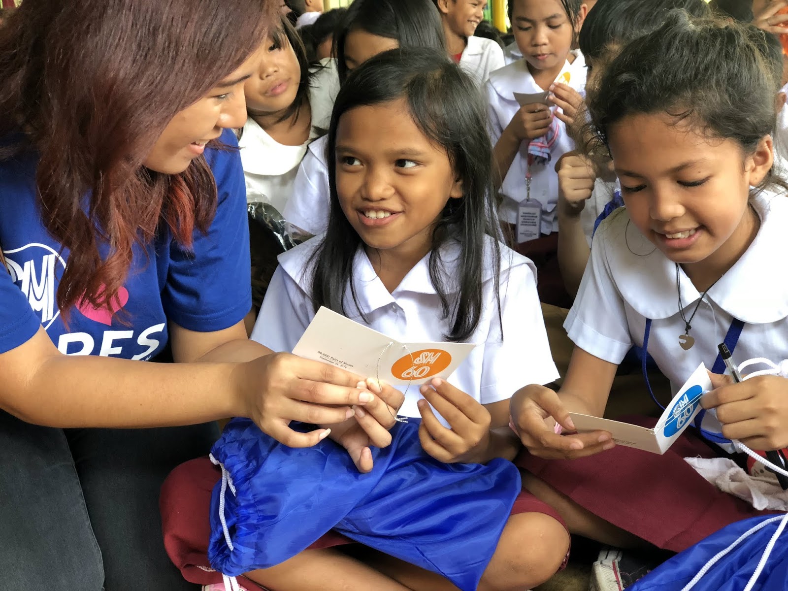 | SM City San Jose Del Monte employees enthusiastically distribute new shoes to grade school pupils of Tungkong Mangga Elementary School as a part of the celebration of SM’s 60th anniversary. |